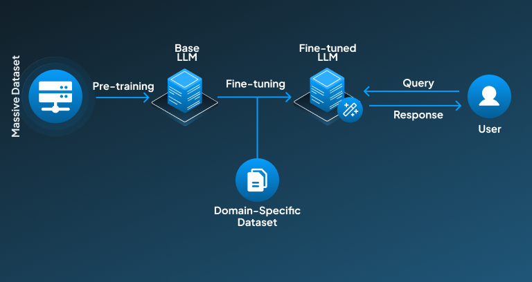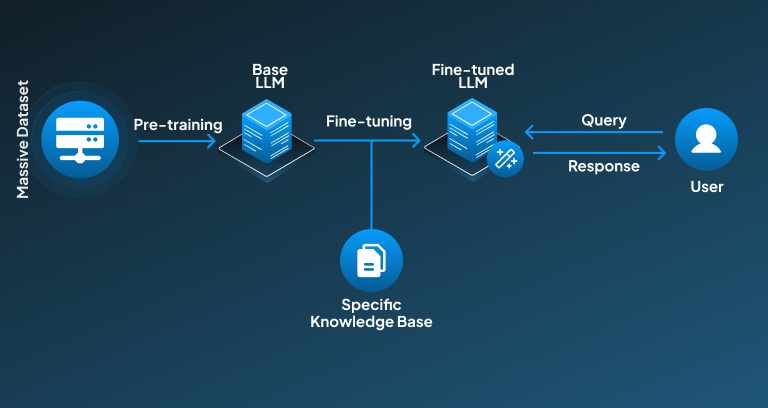 Fine-tuning alone is utilizing pre-trained machine learning models and training them on a more focused specific dataset to improve its performance for domain-specific tasks. However tuning LLMs means re-training an already existing LLM which is executing general purpose tasks, this involves a step of procedure to train the model to exhibit a domain-specific task with enhanced and reliable output, which eventually bridges the gap that general-purpose LLMs are unable to deliver.